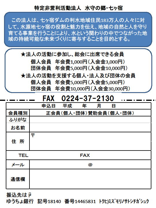 第3条 この法人は、七ヶ宿ダムの利水地域住民183万人の人々に対して、水源地七ヶ宿の役割と魅力を伝え、地域の自然と人を守り育てる事業を行うことにより、水という関わりの中でつながった地域の持続可能な未来づくりに寄与することを目的とする。