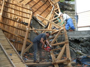 家々にまたがる屋根の切断