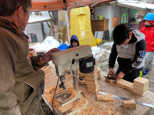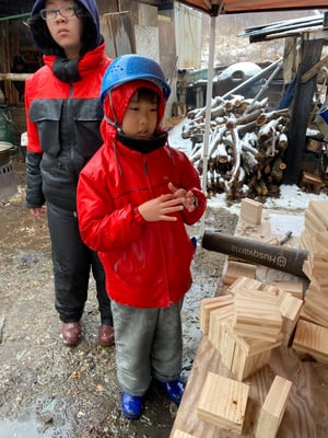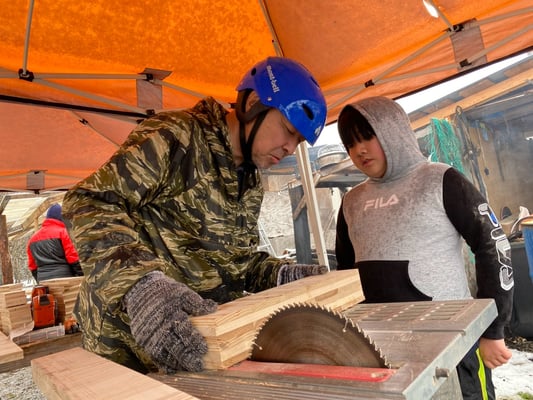 ジンジンとすけっとたっちゃんが板をカットして