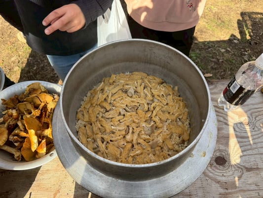 芋煮を下茹でしてくるんと皮をむきいも煮の準備、採ってきたキノコはキノコご飯